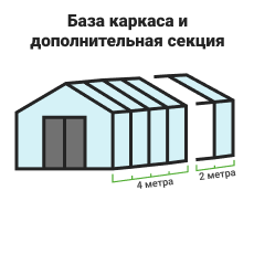 - Длина теплицы — от 4 метров (модель модульная, длина увеличивается кратно секциям);